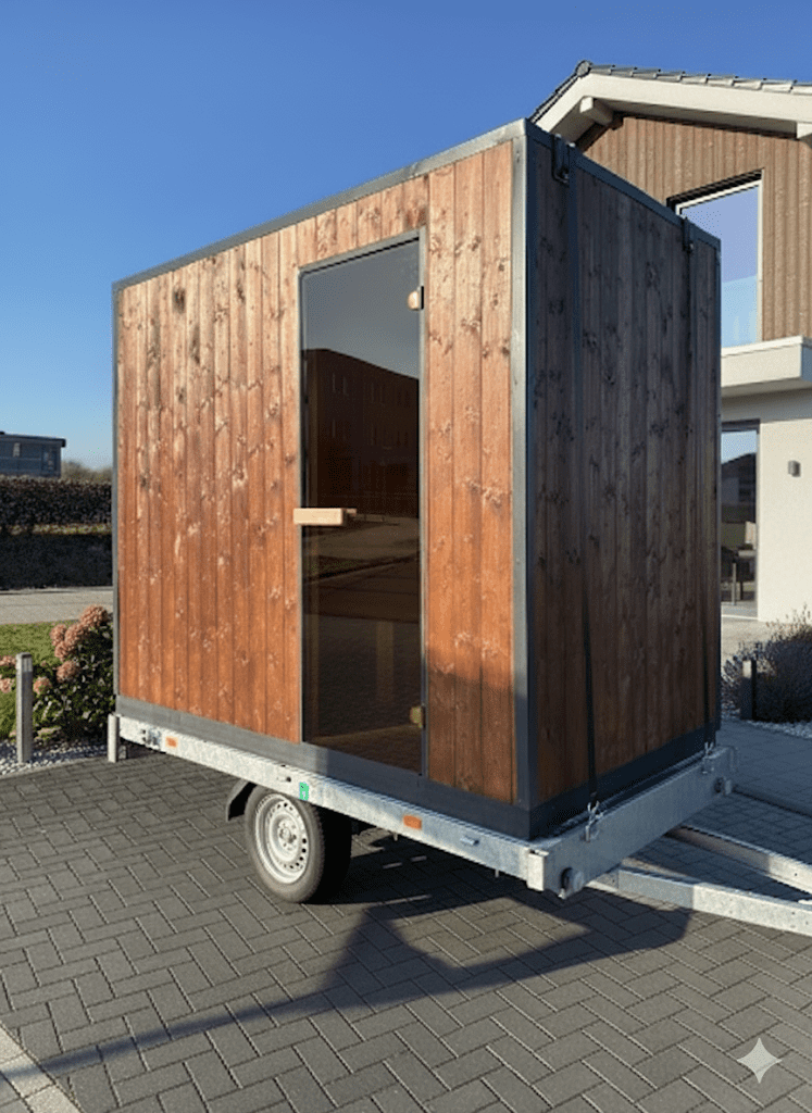 Die mobile-Sauna „Cube S“ ist die kleine Sauna die Platz für bis zu 4 Personen bietet und mit einem Elektroofen ausgestattet ist.