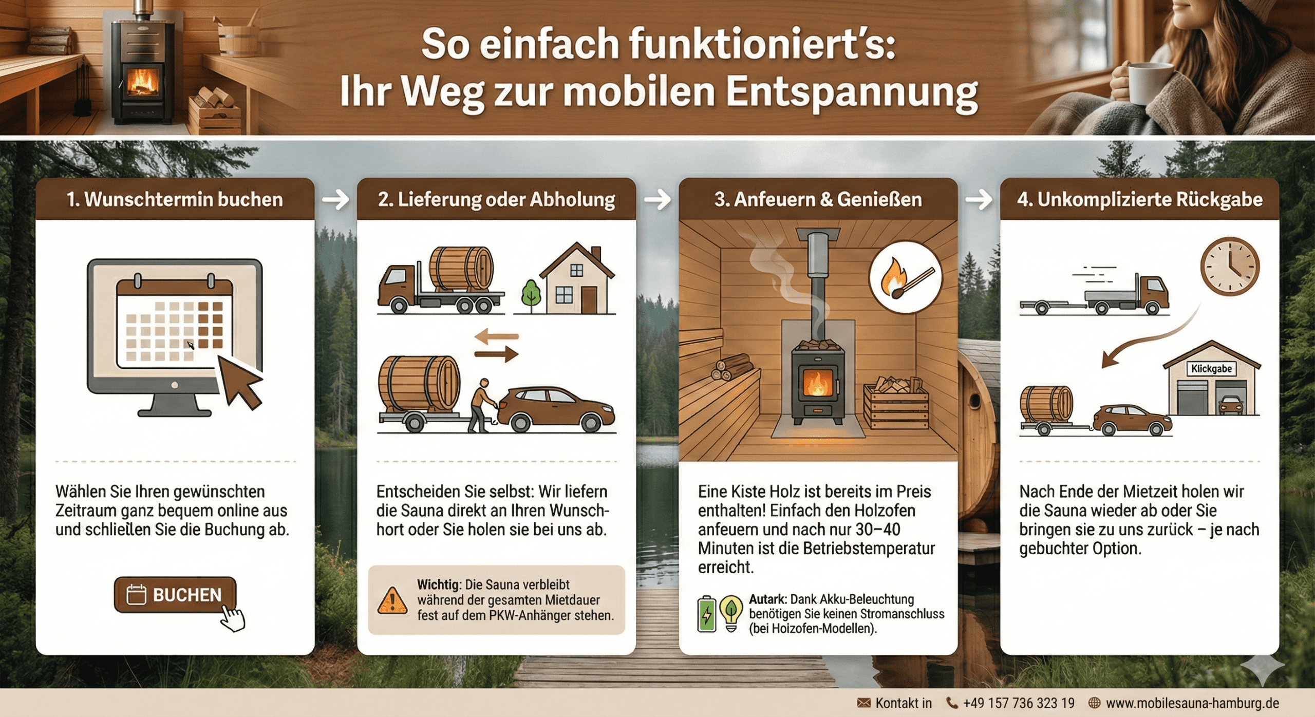 Die mobile-Sauna gibt es in drei Varianten und Größen. Die mobile-Sauna mit Holz-Ofen ist am jedem Ort einsatzbereit komplett autark, egal ob am See, Zuhause, im Wald oder einem anderen Wunschort. Die mobile-Sauna mit Elektroofen hingegen können Sie überall nutzen wo es einen Stromanschluss (Steckdose 230V) zur Verfügung gibt. Die mobile Saunen können Sie selbst abholen oder an einem Wunschort anliefern lassen.