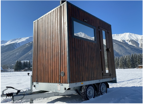 Die mobile-Sauna „Cube L“ ist die große Sauna die Platz für bis zu 6 Personen bietet und mit einem Holzofen ausgestattet ist. Diese Sauna verfügt über einen Nebenraum zum entspannen.